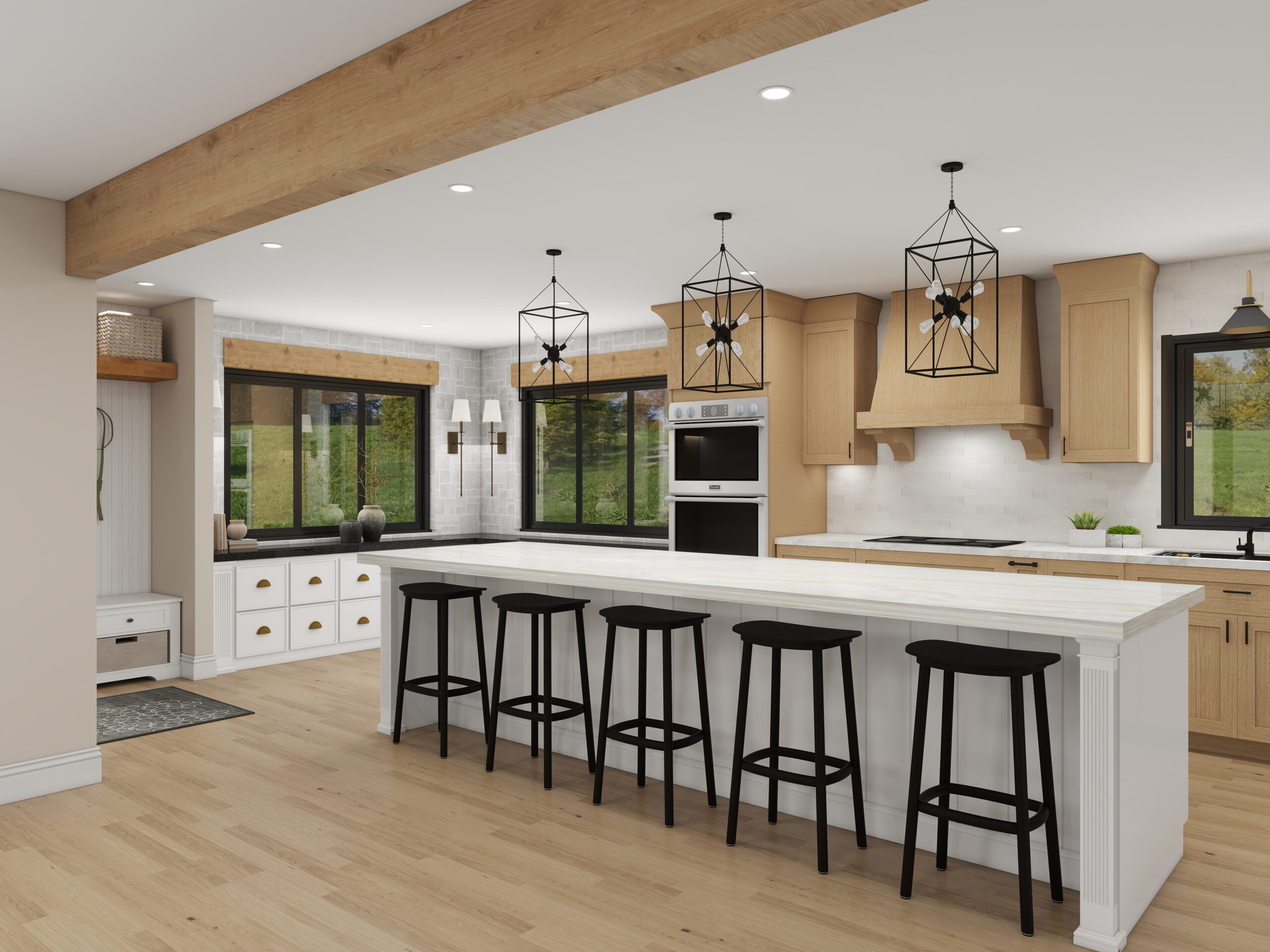 Natural white oak cabinetry and a custom wood hood bring organic texture, while crisp white countertops and a light backsplash keep the palette fresh and airy. The oversized island anchors the room with generous prep space and seating for five, making it ideal for gathering and everyday living.